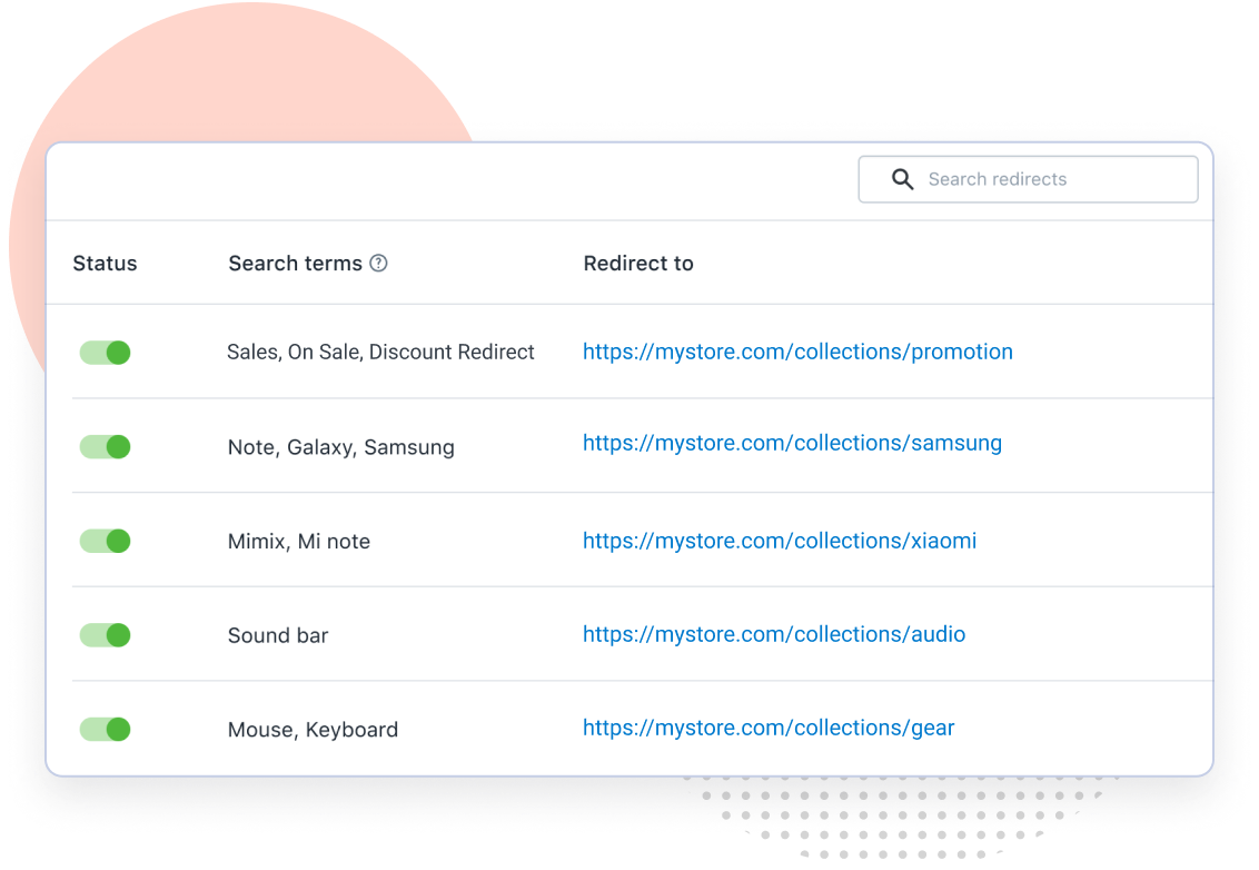 This setting allows shoppers to immediately access a specific page right after they type a keyword and hit “enter". Use this to lead searchers to Sales collection when they look for keywords like discount, promotion, on sale.