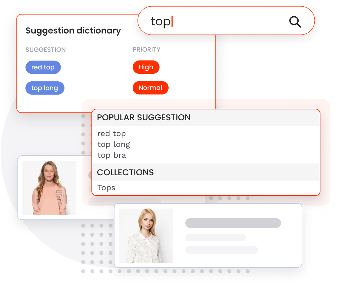 When shoppers search for related queries, they will see keywords that are set up with High priority in Suggestion Dictionary on top of the Popular Suggestions section and are more likely to click.